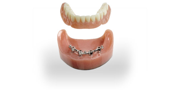 À la différence d’une prothèse conventionnelle, la prothèse sur implants est munie de pièces métalliques permettant de la fixer directement sur un ensemble de points d’ancrage, les implants.